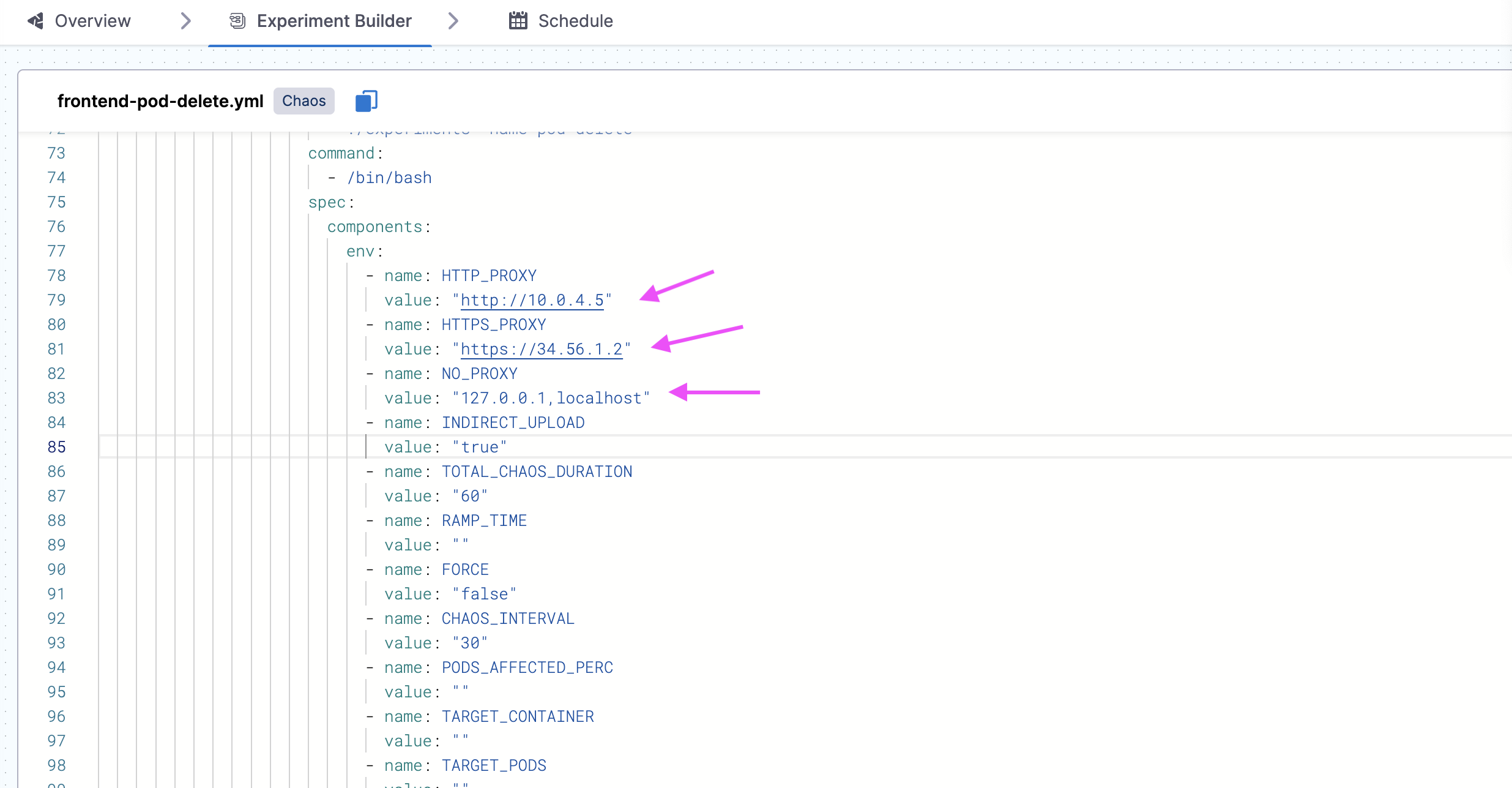 Select YAML view in the Experiment Builder, and click Edit Yaml, and provide values for HTTP_PROXY, HTTPS_PROXY, NO_PROXY and INDIRECT_UPLOAD as shown in the diagram.
