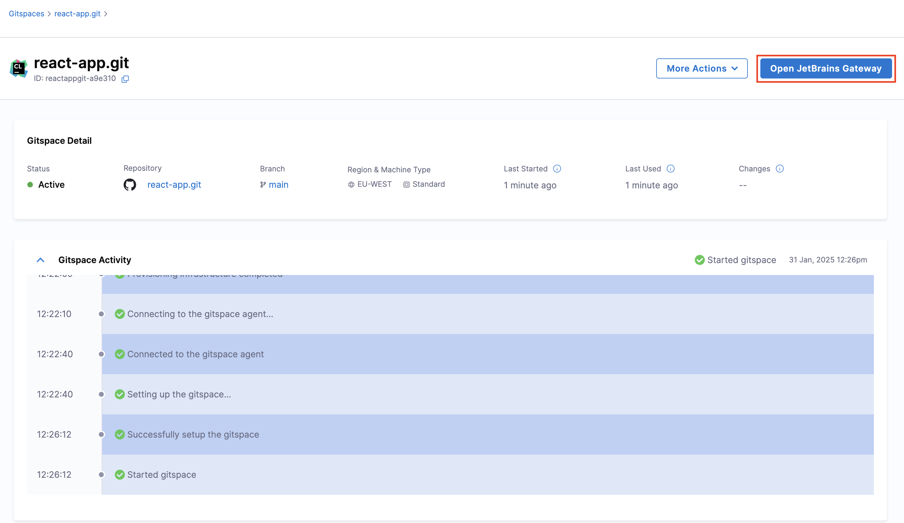 1. Once the Gitspace is created and running, click on the "Open JetBrains Gateway" button.