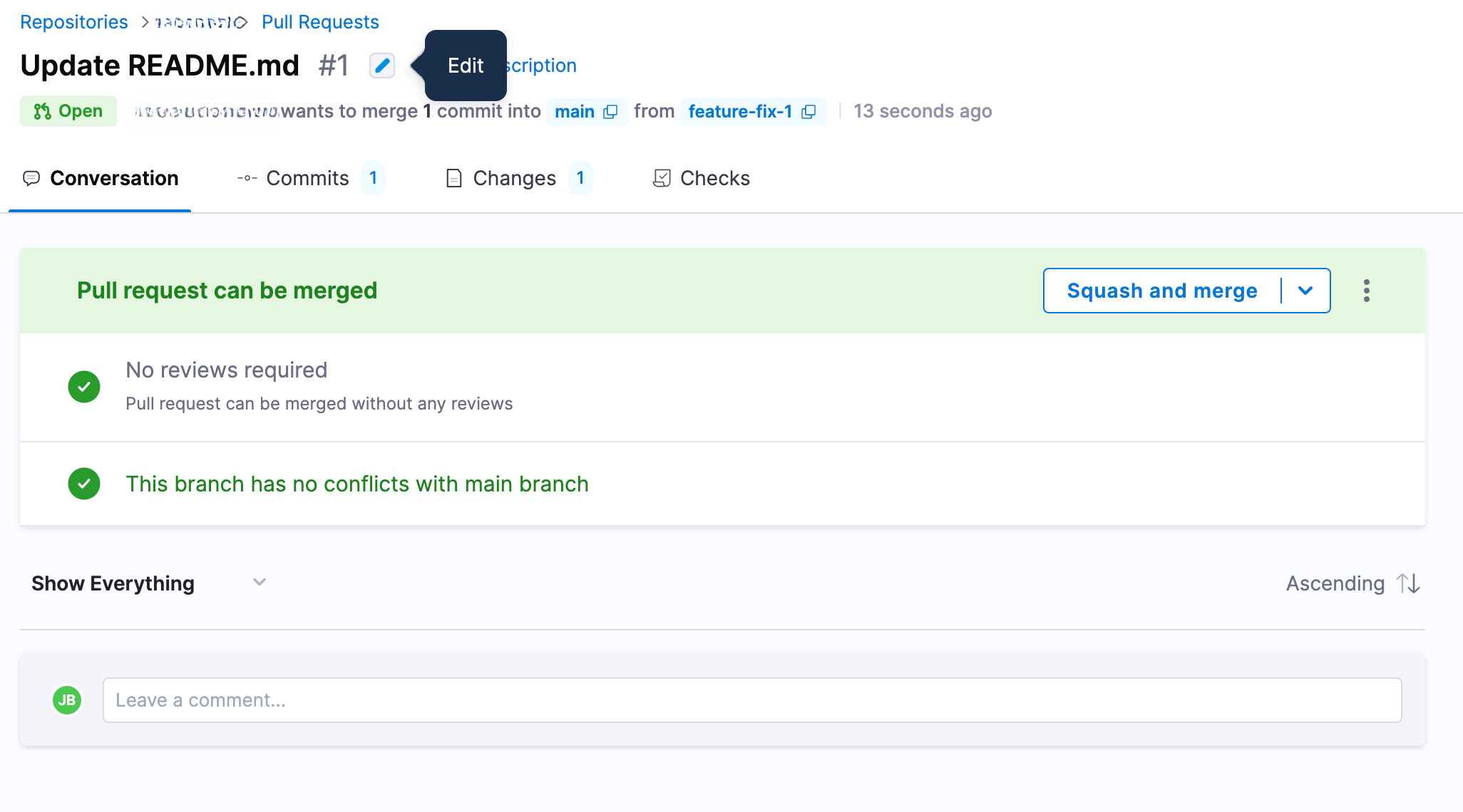 - In the pull request view, click the edit icon next to the PR title (the same icon used to edit the PR title).