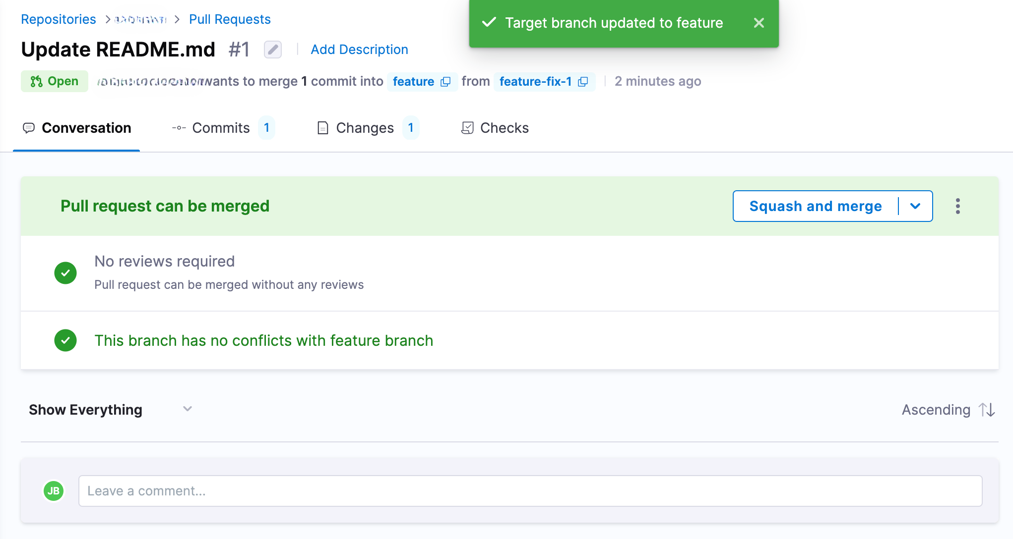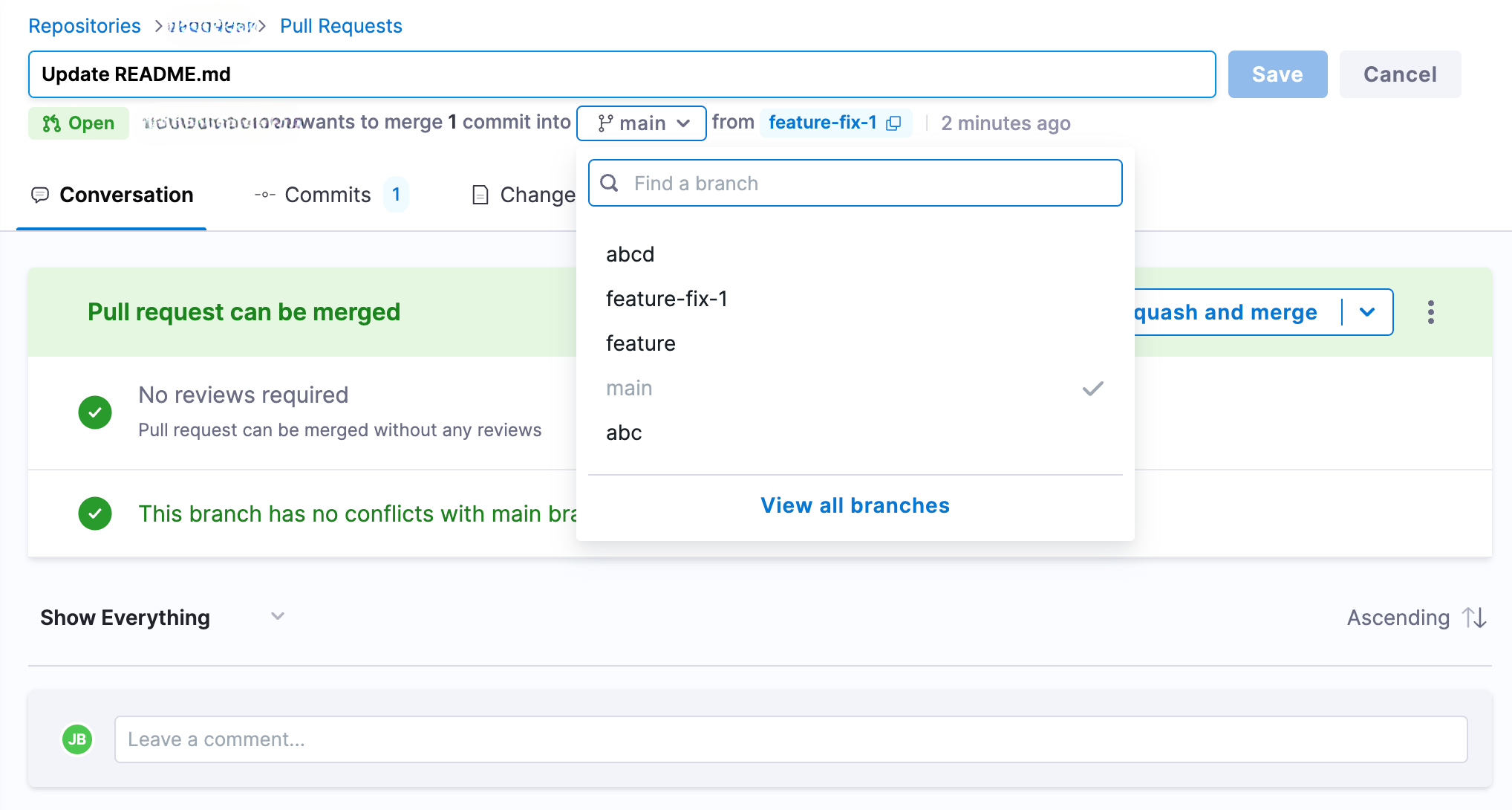 - Click the Save button to update the target branch for the pull request.