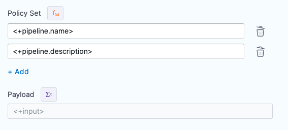 You can select Expressions for one or both settings and when the pipeline is executed Harness will resolve the expressions for the Policy Set and/or Payload for the step.