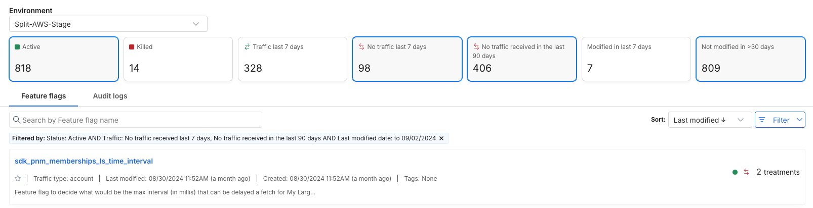 To surface the feature flags that fall into the first two criteria, within the Environments tab in your Split dashboard, you have the option to filter by;