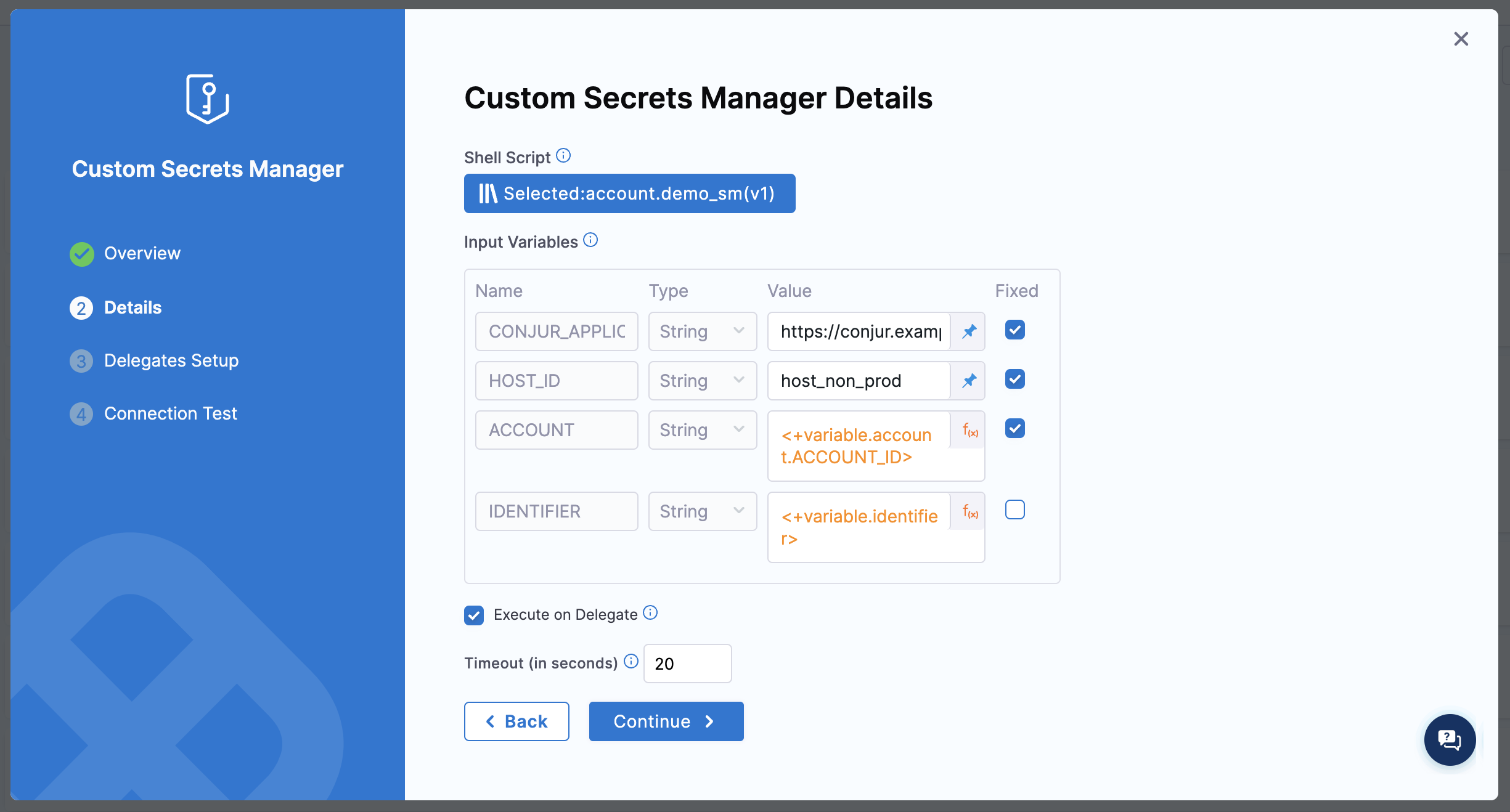 - Select Fixed to make the variable values fixed. Harness won't ask you these values when you create Secrets.