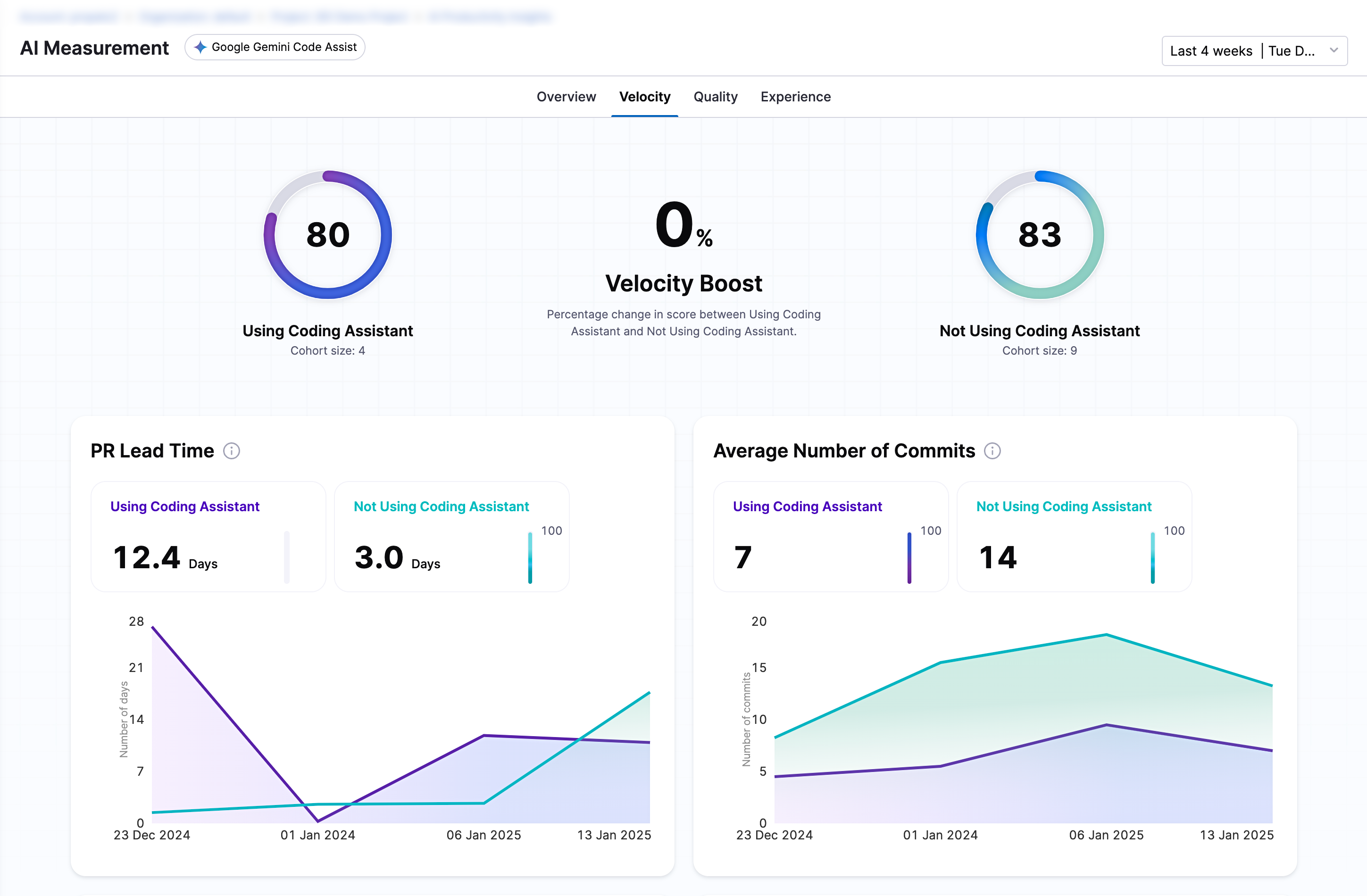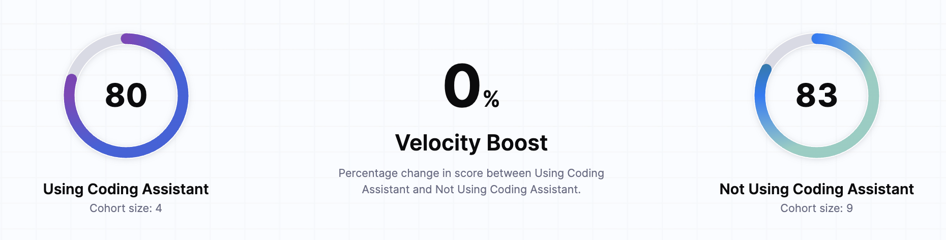 The Velocity Boost represents the percentage change in the overall velocity score when comparing teams using AI coding assistants versus those who aren't. This metric helps quantify the productivity improvement AI tools bring to your development process.