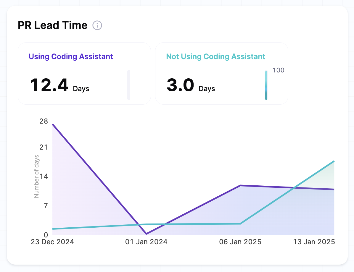 The widget displays the current averages for both the cohorts i.e. teams using AI tools compared to those not using them. It also includes trend lines that show daily changes in lead time over the specified time period, in terms of number of days taken to complete a PR.