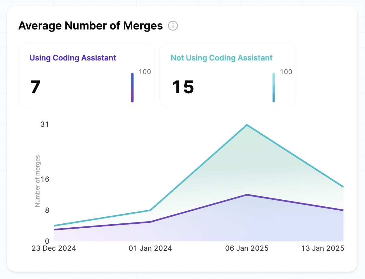 • If developers using AI tools have a higher average number of merges per week, it suggests that AI-assisted development is enabling faster integration of code, helping teams move quicker through the review and merge process.