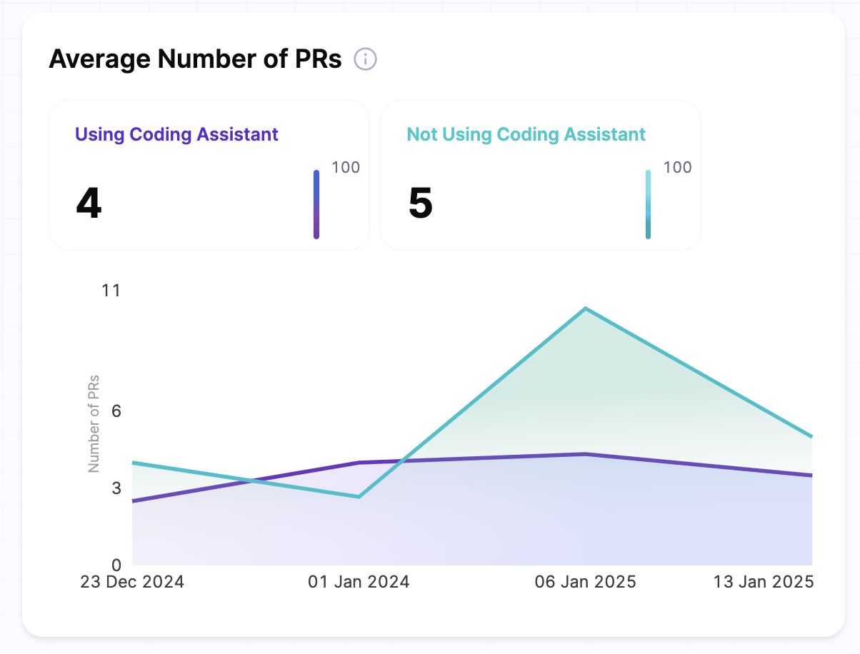 • If developers using AI code assistants have a higher average number of PRs per week, this suggests that AI-assisted coding helps improve developer efficiency.