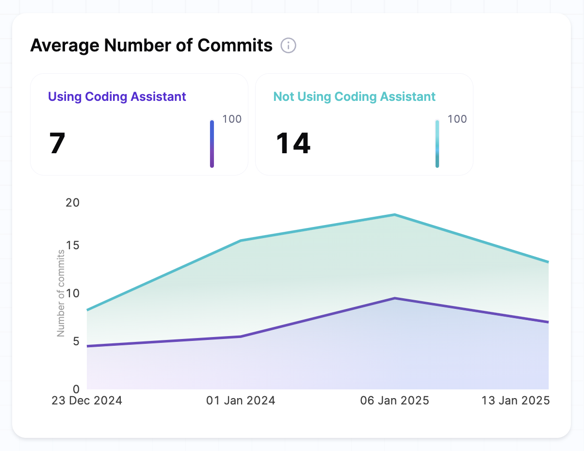 A higher commit frequency often indicates a more active and engaged development team. Stable or increasing trends suggest consistent productivity and effective workflows. Teams using AI tools may show variations in commit patterns, as AI-assisted coding can lead to more consolidated or optimized commits.